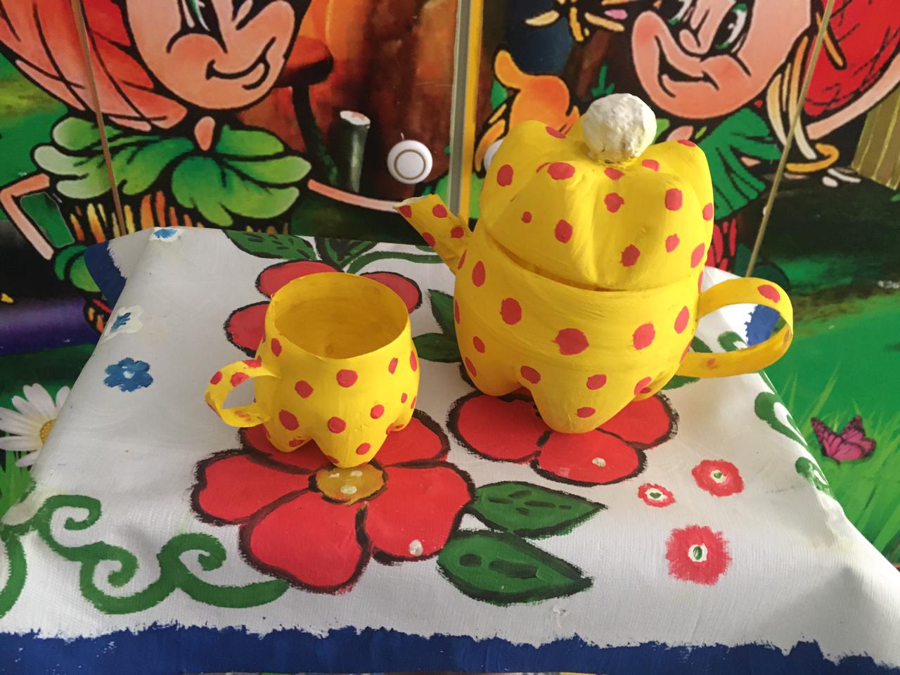 Наша поделка представляет собой яркие, красочные кружку и чайник и стол со скатертью. Поделка эколят полностью выполнены из бросового материала. Для поделки кружки и чайника взяли пластиковую бутылку, для стола использовали маленький ящик, для скатерти взяли кусочек старой клеенки и раскрасили ее.